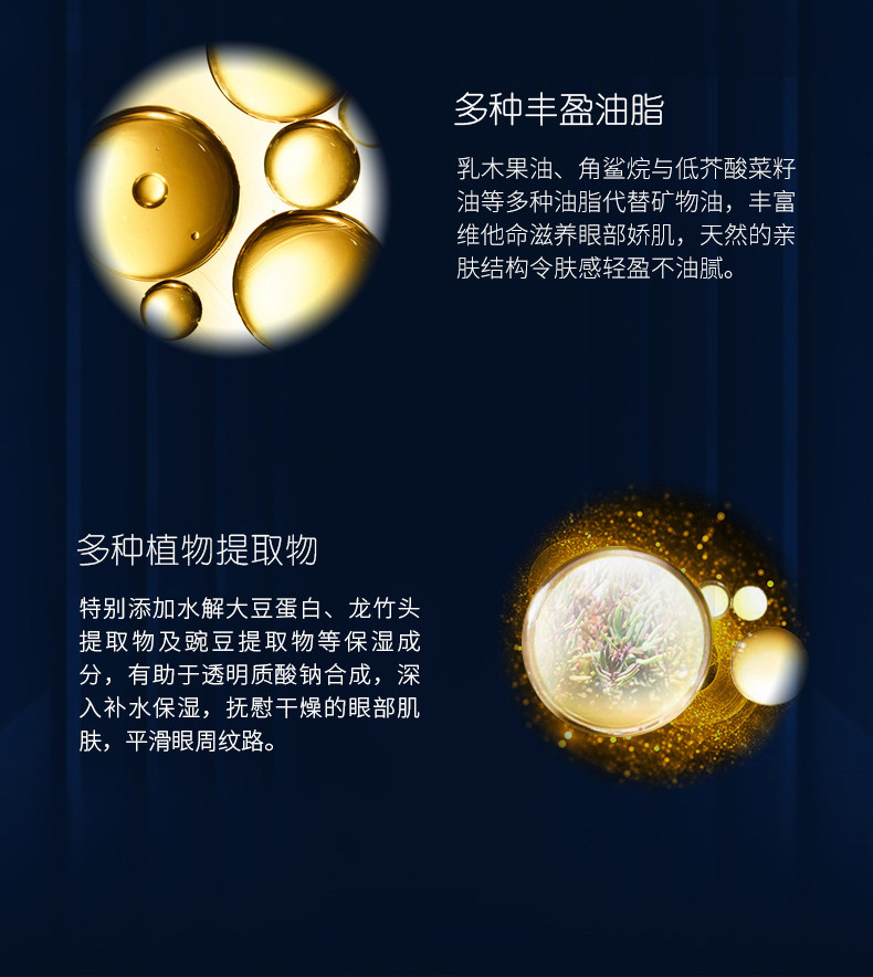 乳木果油、角鲨烷与低芥酸菜籽油等天然油脂,卓效渗透滋润,令眼周肌肤柔滑细腻;复合活性因子,唤醒眼部神采。