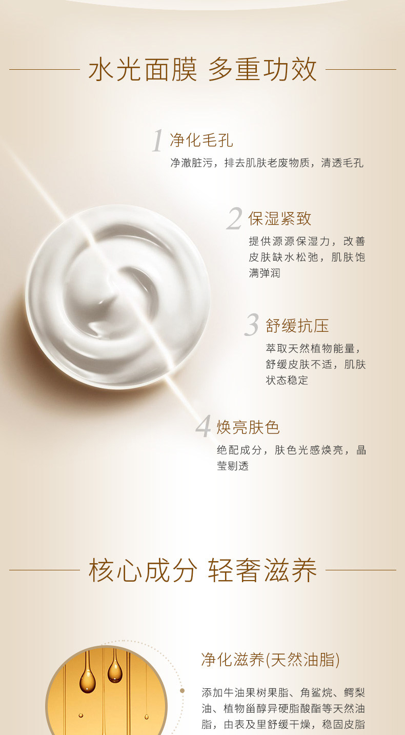 蕴含人参、金盏花、问荆、藻类等数十种植物精粹,为肌肤补充水分及营养元素;天然油脂,在肌肤表层形成修护膜,封锁营养,密闭渗透,深层滋养,令肌肤饱满、紧致、丰盈,尽显澄澈透明感。